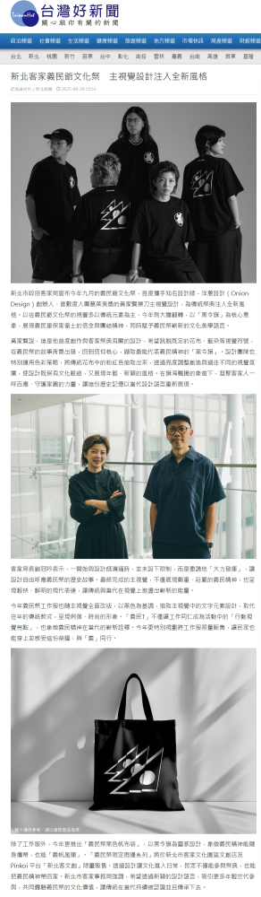 新北市政府客家局宣布今年九月的義民爺文化祭,首度攜手知名設計師-洋蔥設計(Onion Design)創辦人、曾數度入圍葛萊美獎的黃家賢操刀主視覺設計,為傳統祭典注入全新風格。以往義民爺文化祭的視覺多以傳統元素為主,今年則大膽翻轉,以「黑令旗」為核心意象,展現義民軍保家衛土的信念與團結精神,同時賦予義民祭嶄新的文化美學語言。