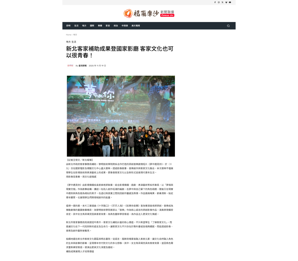 由新北市政府客家事務局補助,黎明技術學院跨系合作打造的原創音樂劇情短片《夢中遇見你》,於(十九)日在國家電影及視聽文化中心盛大首映。透過影像敘事、音樂創作與客家文化融合,本次首映不僅展現學生在影視技術與表演藝術上的成果,更象徵客家文化以全新形式走進現代青年生活。